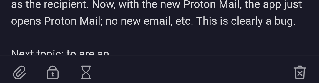 I web browse, select an email address, and choose to send an email via Proton Mail. What happened before the upgrade to the new Proton Mail was that a new email was created (and displayed in the app) with the email address that I’d selected as the recipient. Now, with the new Proton Mail, the app just opens Proton Mail; no new email, etc. This is clearly a bug.