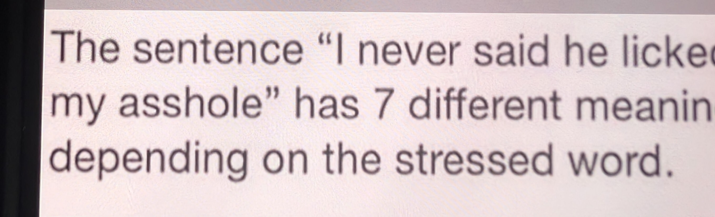 This is why I’m sure spoken English and written English are two different languages. Information is carried through vocal emphasis that the standard alphabet doesn’t contain symbols for. Online we often resort to bold or italics or allcaps, whatever is available.