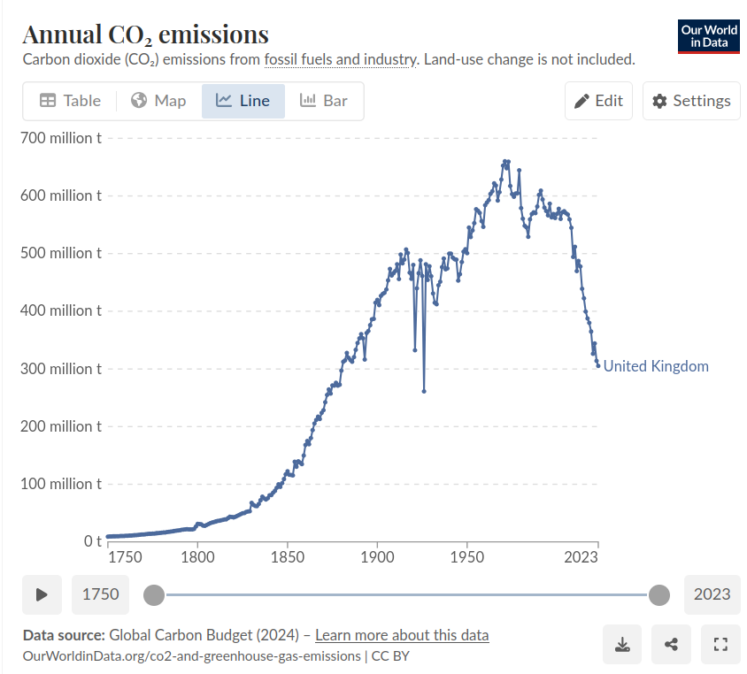 I think they’re just catching up to what countries like the UK did over the past 200 years. So a few hundred thousand more Indian people can afford cars or international holidays these days - that seems fair enough. what’s the indian GHG emisiions per capita? https://en.wikipedia.org/wiki/List_of_countries_by_greenhouse_gas_emissions_per_capita sorry still old data, but 2023 they were not much over half the UK , so what is the fair share of ghg emissions for a person in India? Any why should it be lower than , say, UK - who has a centuries old legacy of fucking the climate. The UK has a hell of a lot more reducing ghg per person to do before it can be any sort of role model -b and thats after nerfing it’s own heavy industry and not counting GHG embodied in imports.