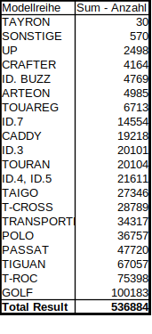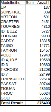 In den Top 3 waren bei VW in 2024 (in Deutschland) 2 SUVs dabei, erst auf Platz 4 und 5 kommen Passat und Polo. Platz 1 belegt der Golf, der ist mit id.3 bereits seit 2020 elektrisch vertreten. 2025 sieht bis jetzt ähnlich aus, der Polo fällt allerdings massiv ab bzw. wird vom id.7 ersetzt.