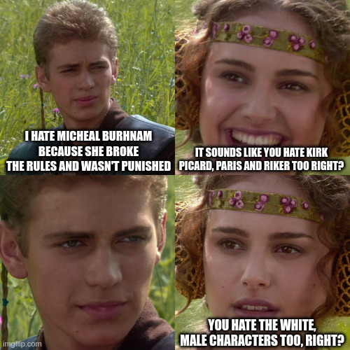So while you’re right, most of the major cast is cishet, I think there’s more people who hate it for being “woke” than for being not progressive enough, as I haven’t heard the latter much but the former is annoyingly common from the usual suspects. There simply hadn’t been actual representation of any of those groups (except the depraved bisexuals) in Star Trek before Discovery.