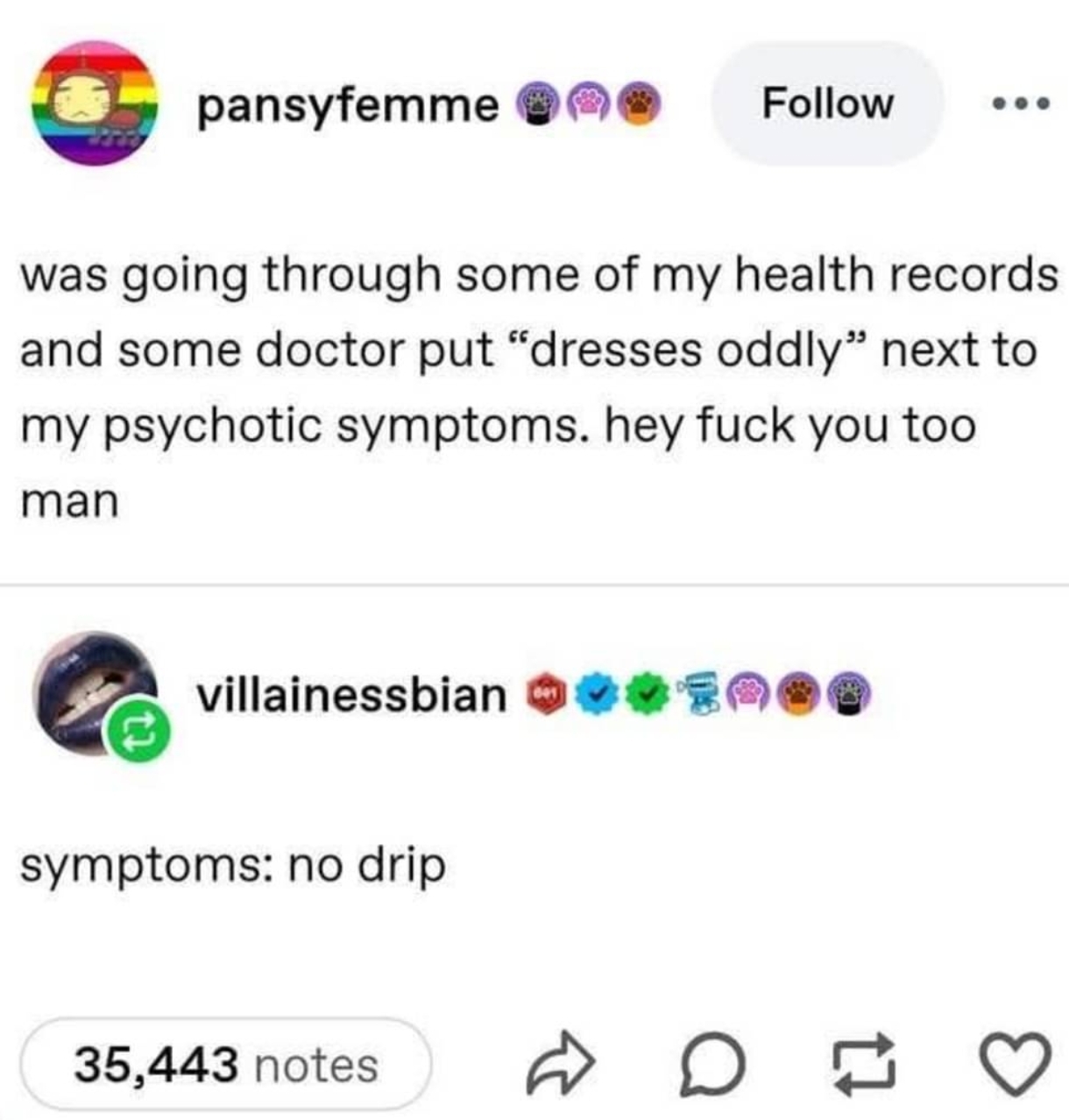 minus-squareBinzy_Boi@piefed.calinkfedilinkEnglisharrow-up44·7 days agoThe doc diagnosing me with psychopathy after showing up to his office in socks and sandals.