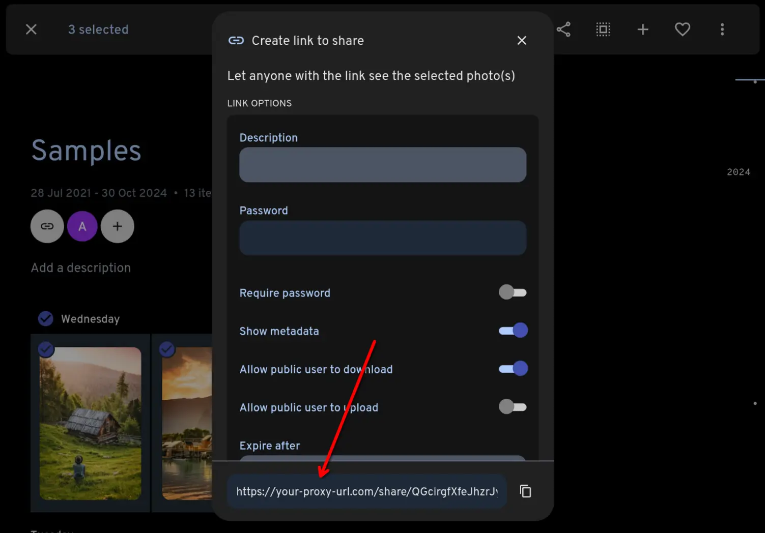 Set the “External domain” in your Immich Server Settings to be whatever domain you use to publicly serve Immich Public Proxy. Now whenever you share an image or gallery through Immich, it will automatically create the correct public path for you.
