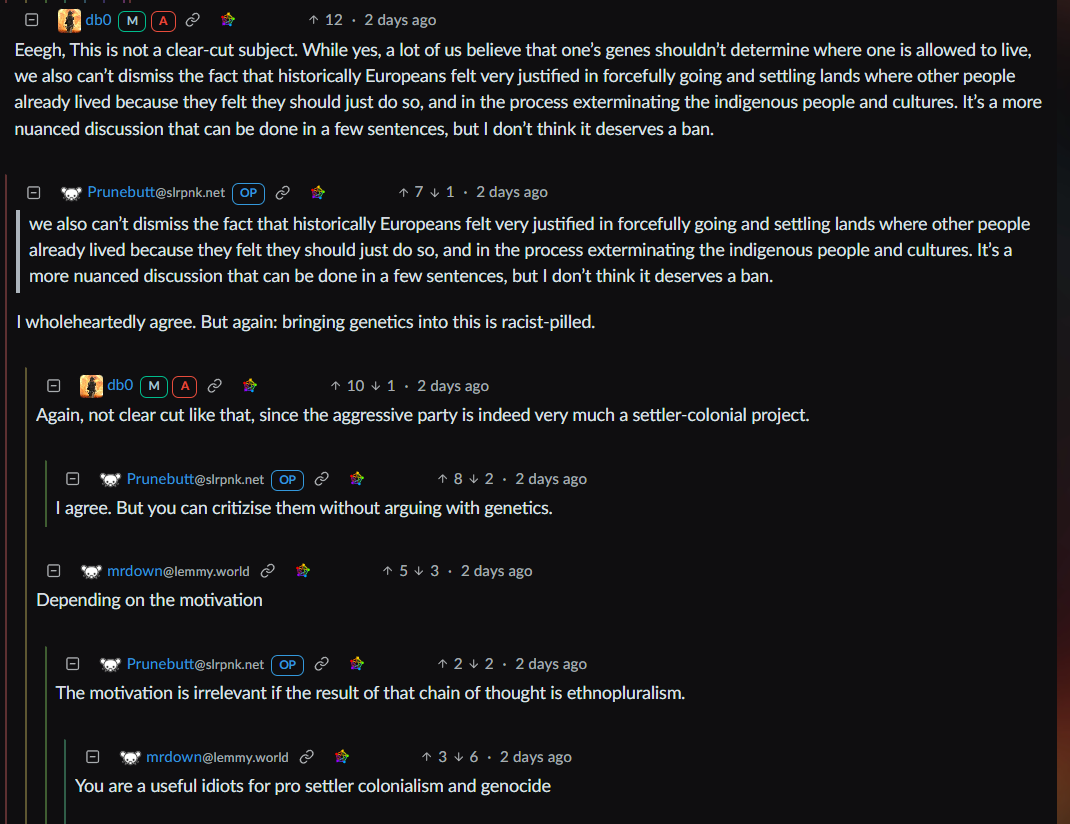 I just don’t understand anyone’s logic here. I feel like you can defend someone’s right to be somewhere because of their historical ties to a region, but I don’t think you can use it to deny someone else’s right to also live their cooperatively. That has been my understanding of decolonization. Its not about kicking all the colonial settlers out, but about removing the inequality and hierarchy when it comes to management of the land and living there.