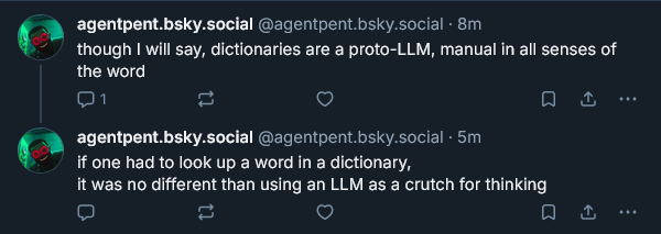 (Somebody linked 2 chatgpts (or groks, I don’t recall which anus like logo it was) speaking to each other and they kept repeating variants of the lasts bits).
