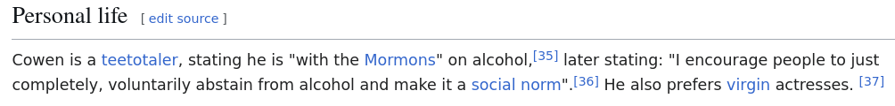 screenshot of Tyler Cowen’s Wikipedia article, specifically the “Personal life” section. The concluding sentence is “He also prefers virgin actresses.”