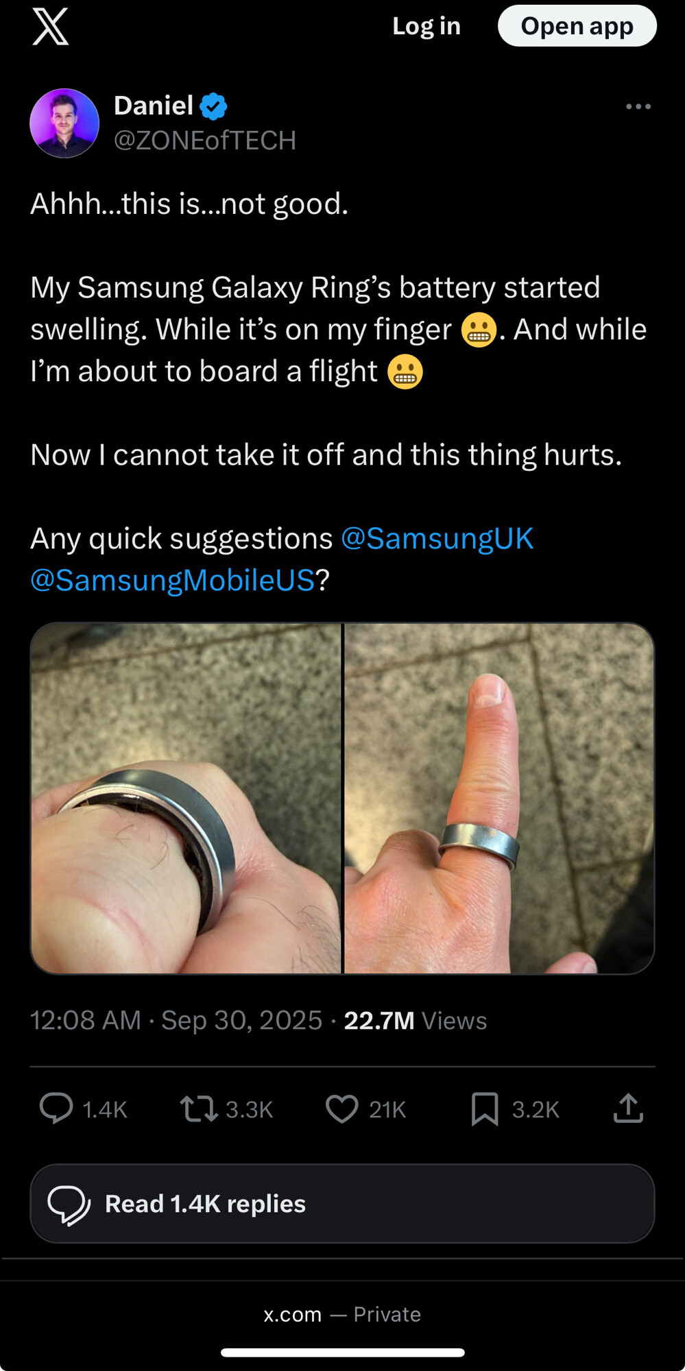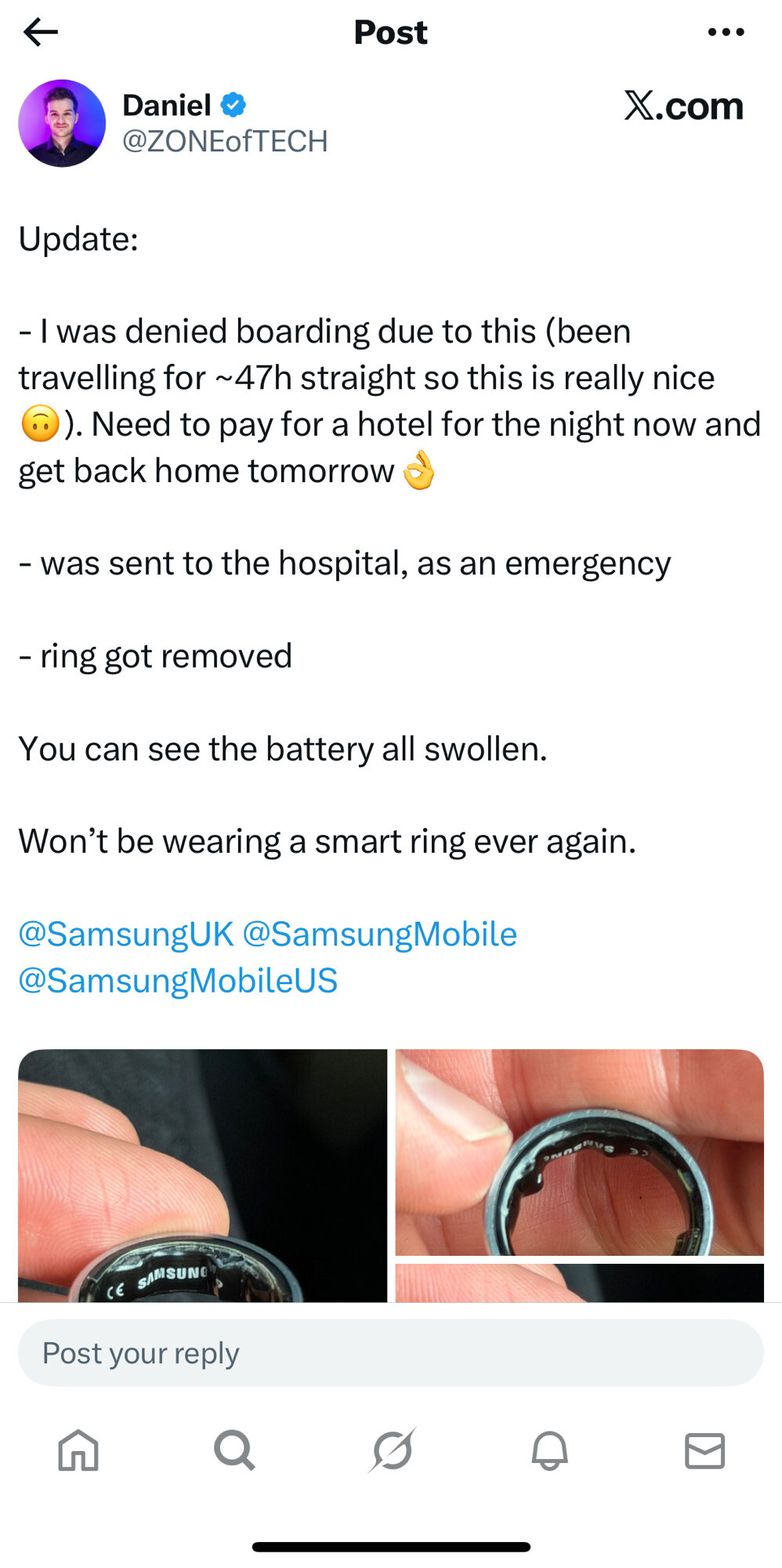 Daniel aka ZONEofTECH on x.com: “Ahhh…this is…not good. My Samsung Galaxy Ring’s battery started swelling. While it’s on my finger 😬. And while I’m about to board a flight 😬 Now I cannot take it off and this thing hurts. Any quick suggestions