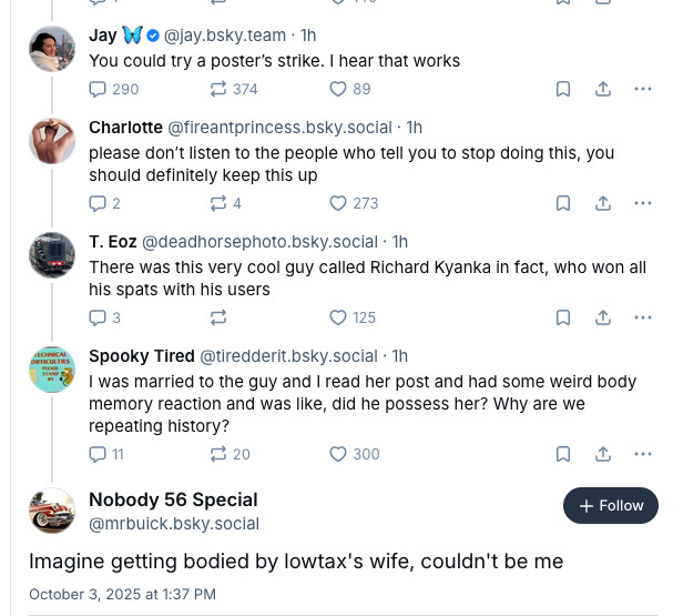 They really cannot cope with the fact that their user base aren’t politically aligned with them, and are desperate to appease the fash (witness the crackdowns on people’s reaction to charlie kirk’s overdue departure from this vale of tears) and have currently reached the Posting Through It stage. I’m assuming at some point their self-image as Reasonable Centrists will crack and one or more of them will start throwing around transphobic slurs and/or sieg-heiling and bewailing how the awful leftists made them do it. Anyone want to hazard a guess at a timeline?