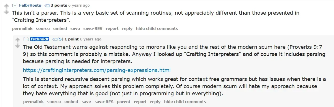He then complains about how his parser was met with scorn by Modern Programmers, because they were too stupid to appreciate how good it was?