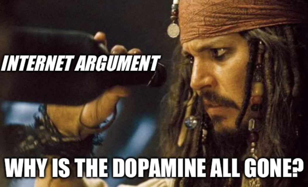 That explains why I get antsy when I havent been online for a while. I cant argue with people endlessly in real life. Nobody likes that guy.
