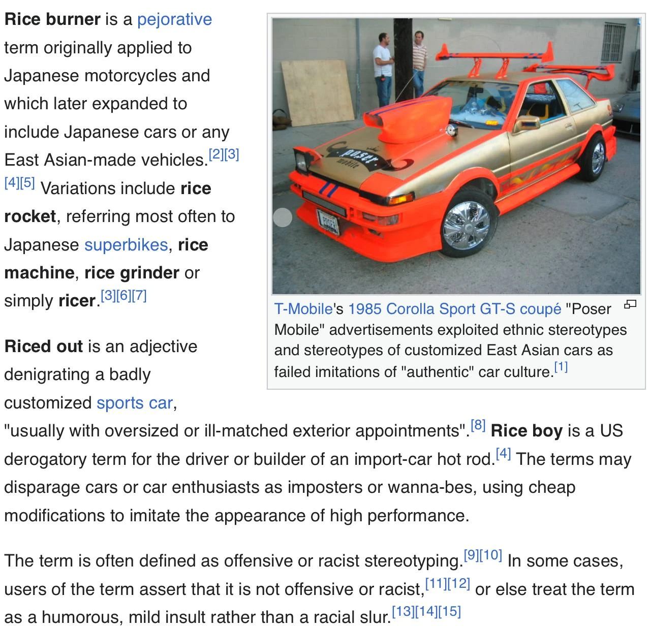 Calling the term “rice” in connection to focusing on aesthetics over preformance racist just seems insane to me. There are objectly racist uses of the word rice to harm Asians. However when 99% of the community never even correlated this useage of the word to anything derogatory twords asians, and even use it positivly when someone genuinely likes JDM or overbuilt cars, the word stops being racist