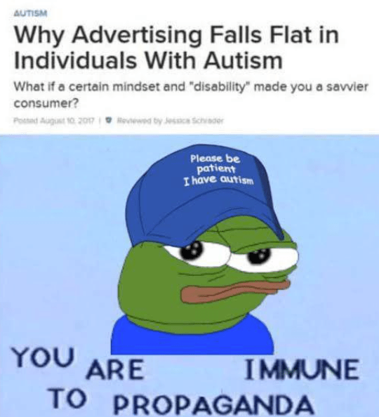 That means when autistic people consume media, they don’t really have an assumption of subtext, or at least not a neutral one. As they analyze the scenario to try to deduce it, the obvious motivations reveal themselves. Obviously this ad is trying to convince me to purchase this good or service, obviously this highly biased ”news" is trying to push a narrative unsupported by the raw facts.