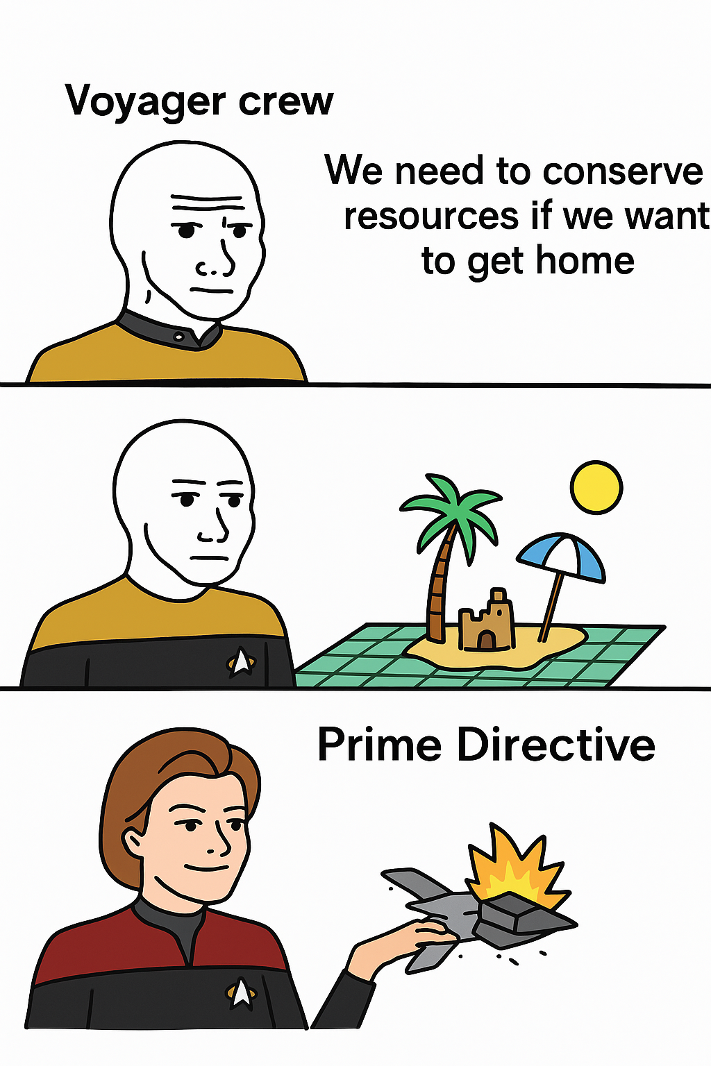No like a multipanel shitpost using a meme template skewering the general plot of star trek voyager where the humor is based on a reductive interpretation of the general premise