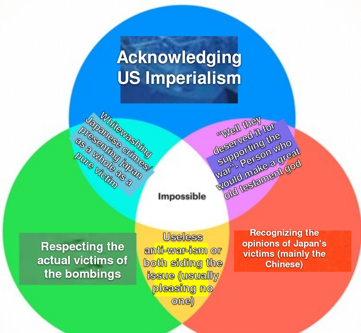 It’s worth noting that the USian narrative in defense of its bombings does not give a single shit about China or Chinese lives. The US was not trying to save China from Japanese imperialism and it has been trying to undermine communist China since the communists gained power. The US took over for Japan in brutalizing Korea and certainly would have done the same in China if they could have.