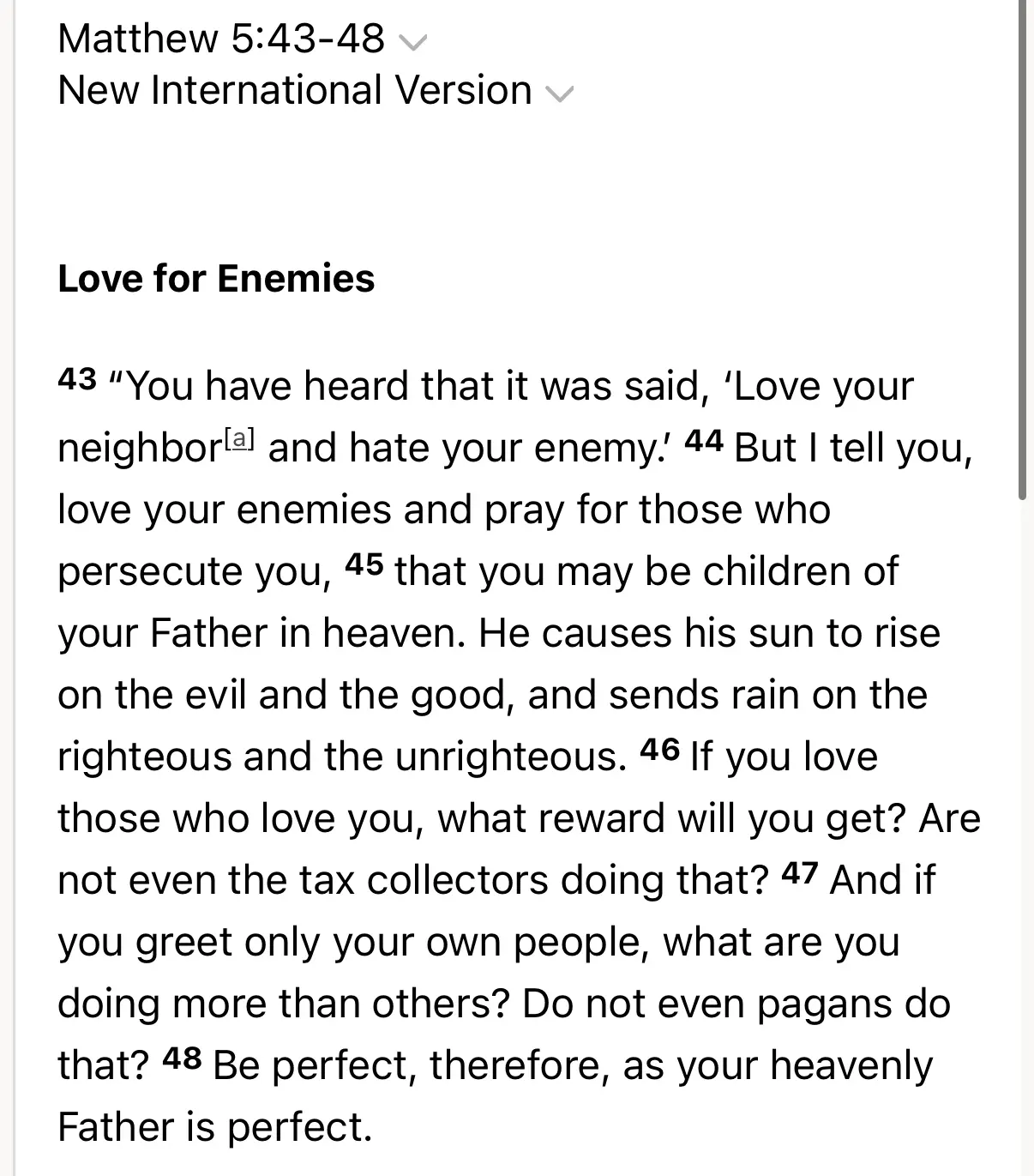 Love for Enemies You have heard that it was said “Love your neighbor and hate your enemy.” But I tell you, love your enemies and pray for those who persecute you, that you may be children of your Father in heaven. He causes his sun to rise on the evil and the good, and sends rain on the righteous and the unrighteous. If you love those who love you, what reward will you get? Are not even tax collectors doing that? And if you greet only your own people, what are you doing more than others? Do not even pagans do that? Be perfect, therefore, as your heavenly Father is perfect.