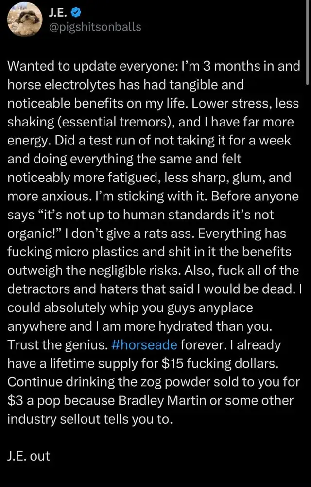 Because if you take horse electrolytes, you wake up the next day with your shoes nailed to your feet with an overwhelming urge to shit in the road.