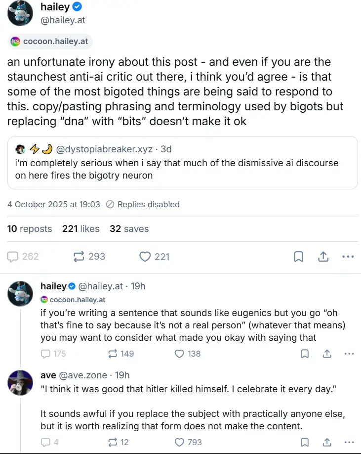 .Hailey.at may currently be dating an AI and feels insecure about others judging them, so they must convince themselves that their linguistic vibrator has a soul.