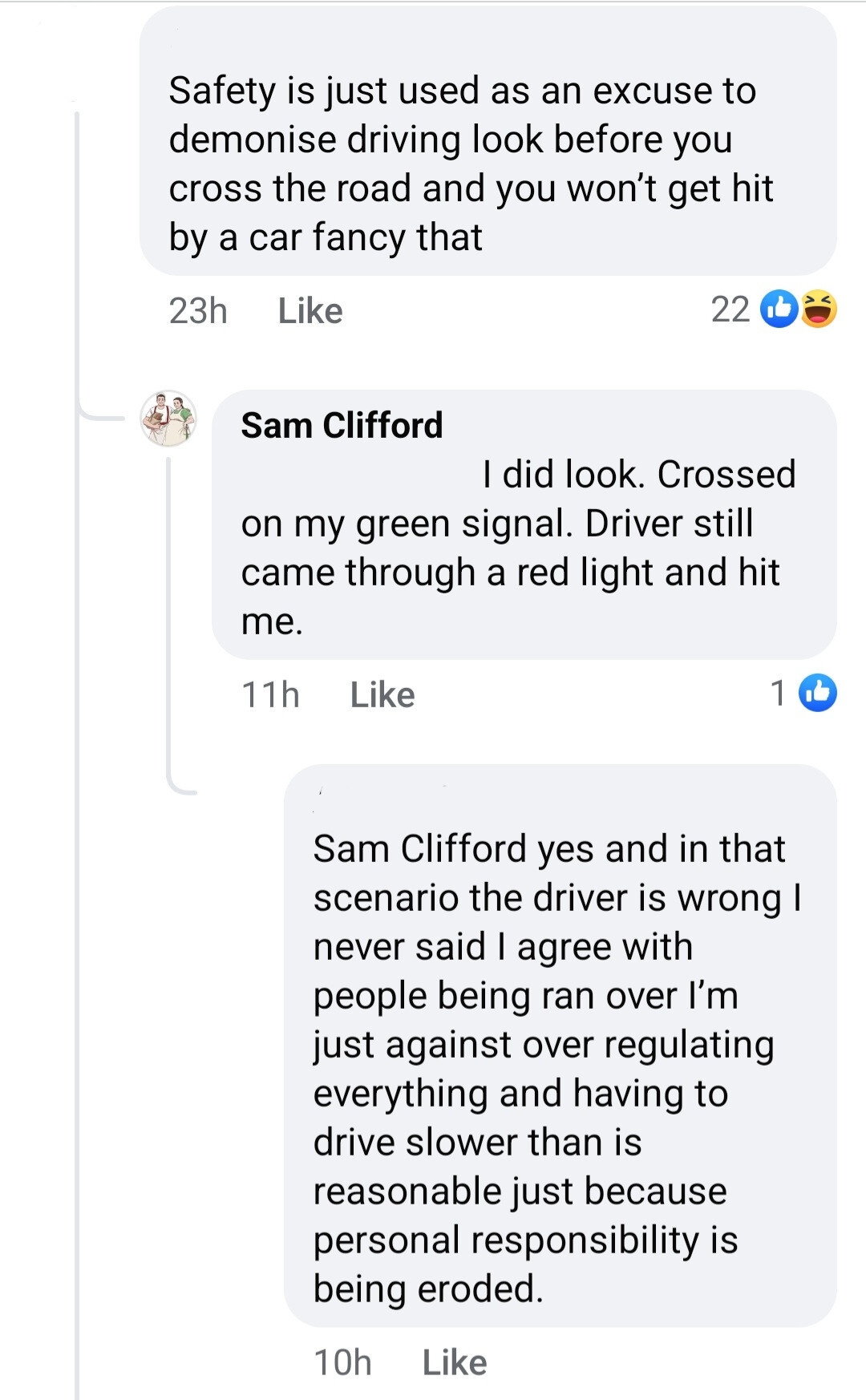 Different person: I’ve been struck on a bike. Driver didn’t look while pulling out of a driveway and hit my rear wheel as I passed directly in front of them. They didn’t notice until I was right by their window (having pushed my bike aside) then they stared blankly at me and drove off. Zero awareness or concern. If I had been slower I’m sure they would have lazily driven over me.