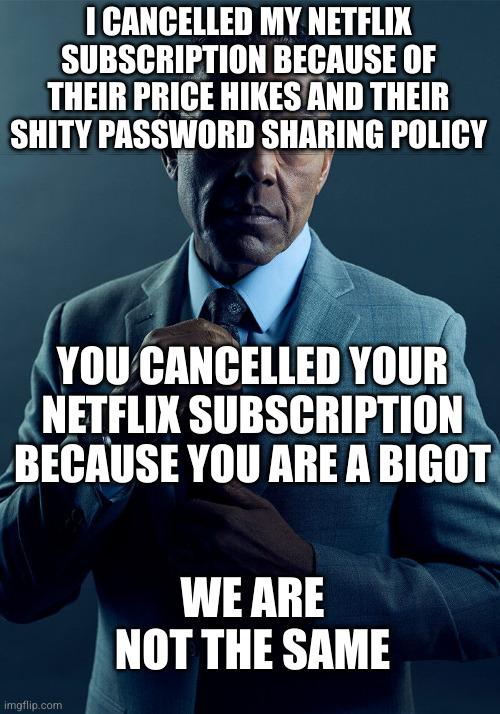 He cancelled netflix because he is scared of trans people. I cancelled netflix because it’s the financially responsible thing to do. We are not the same 😎