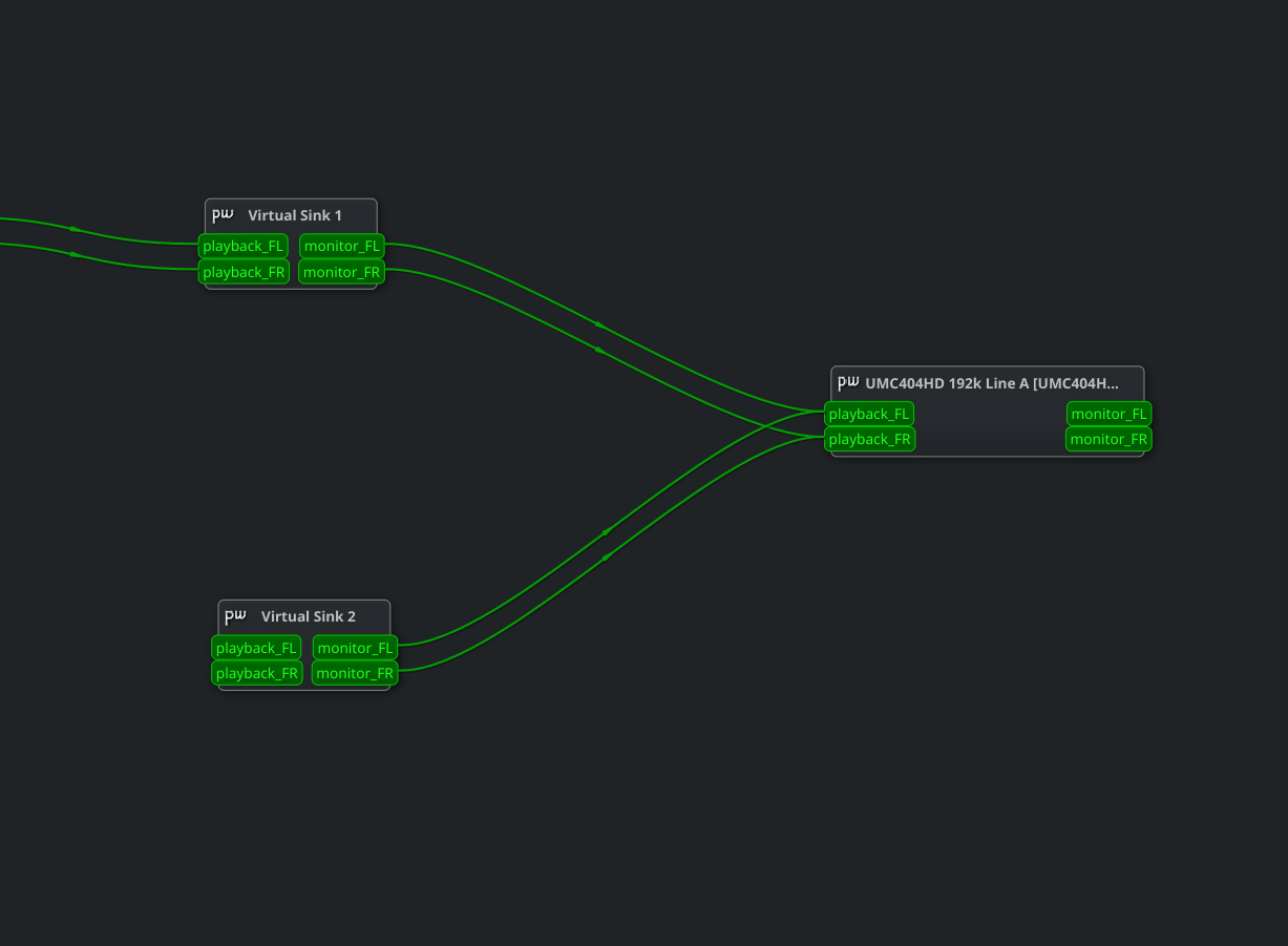 , select it as default device.Start qpwgraph and connect the Virtual sink(s) to your output device(s) by dragging the monitor nodes to the playback nodes: