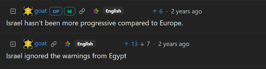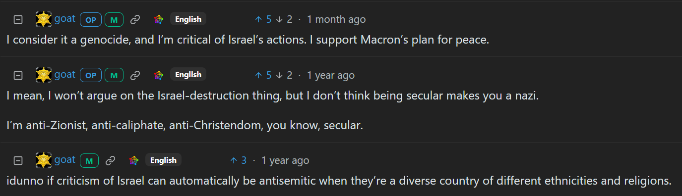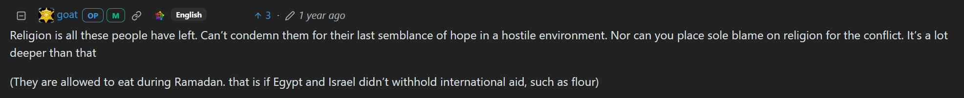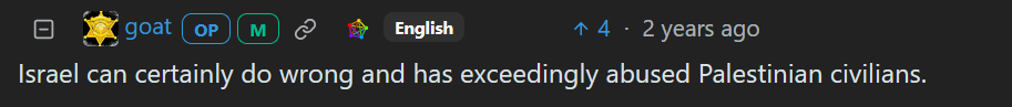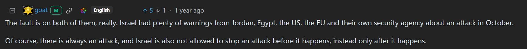 minus-squaregoat@sh.itjust.worksMlinkfedilinkEnglisharrow-up2·22 hours ago Have you considered that you can criticise multiple sides? That one side doing bad doesn’t make another side automatically good? That the innocent are the ones who suffer at the hands of tyrants?