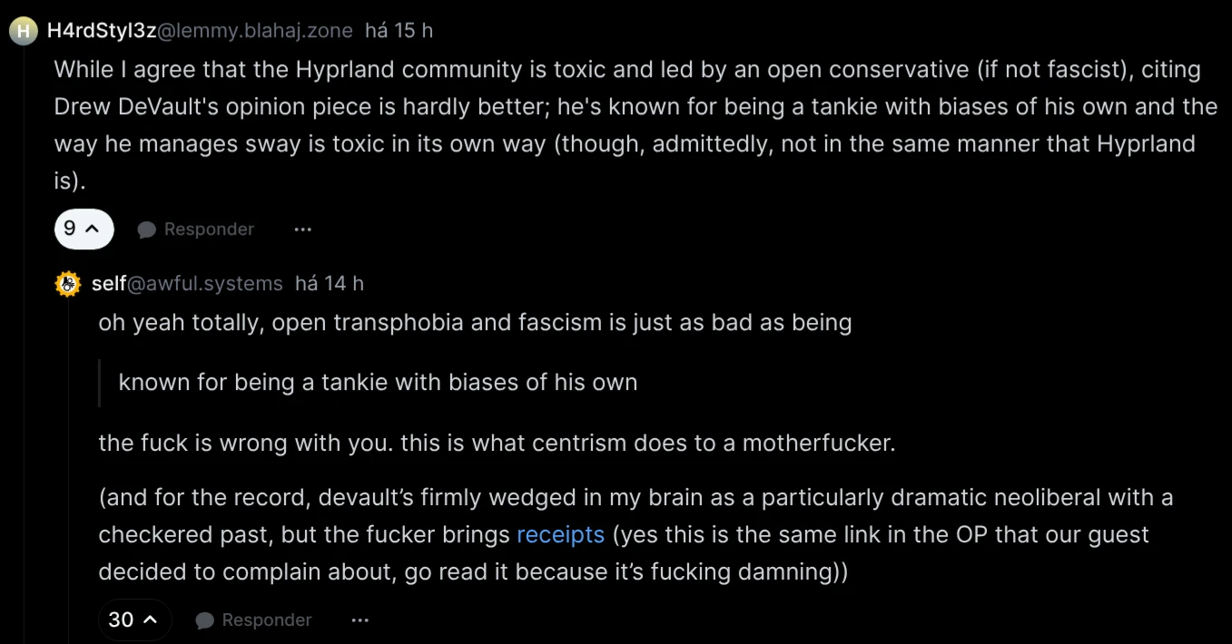 (regarding Drew DeVault’s opinion piece on Hyprland and its conservative/fascist dev and toxic community)