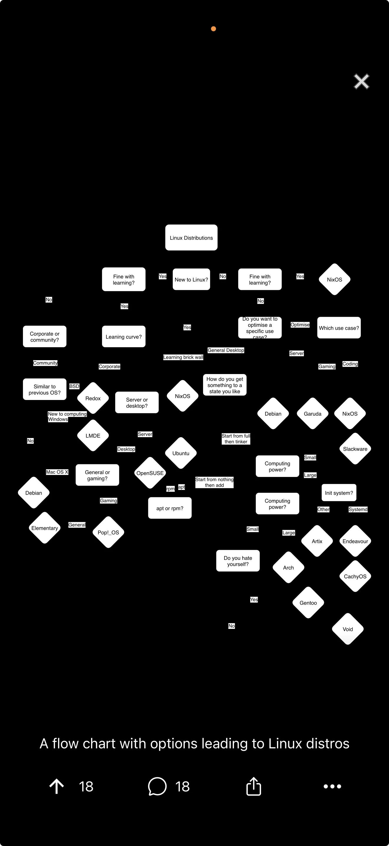 Thank you for the detailed response, but I was merely criticizing the flowchart. I am a Linux poweruser/sysadmin, and roll with arch at home, asahi fedora on my MacBook, and I manage mint/debian at work.