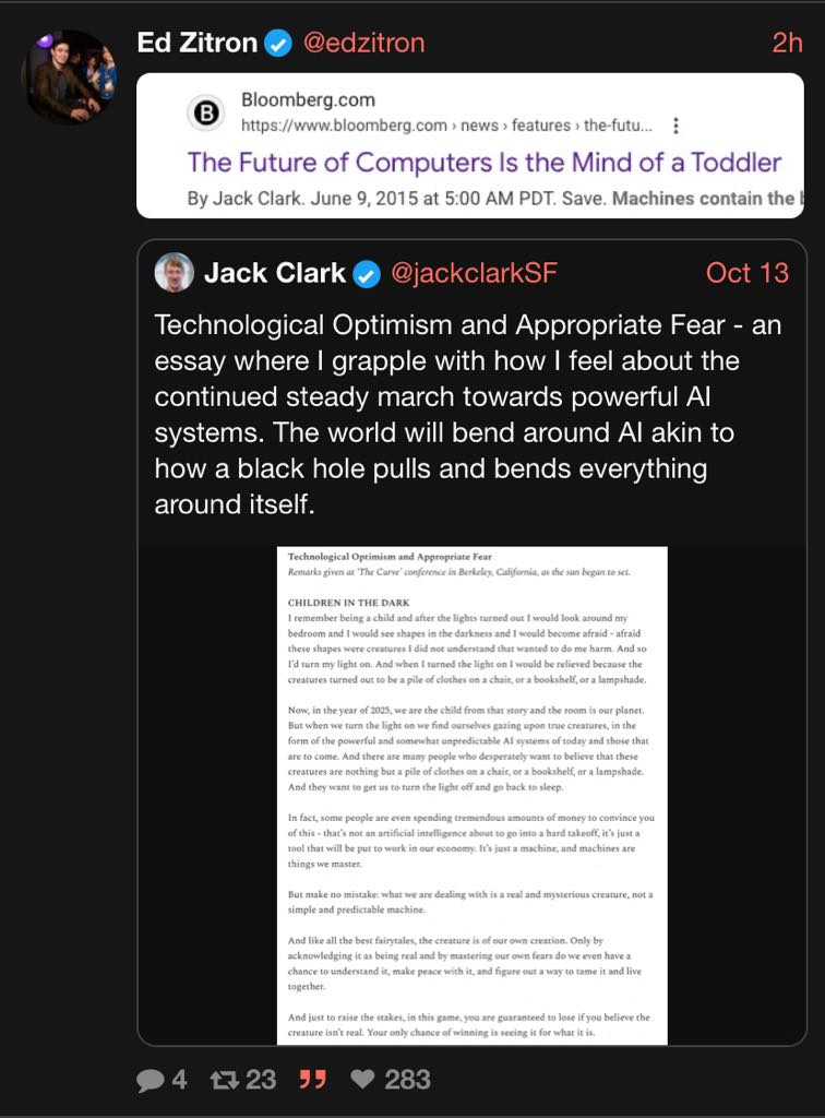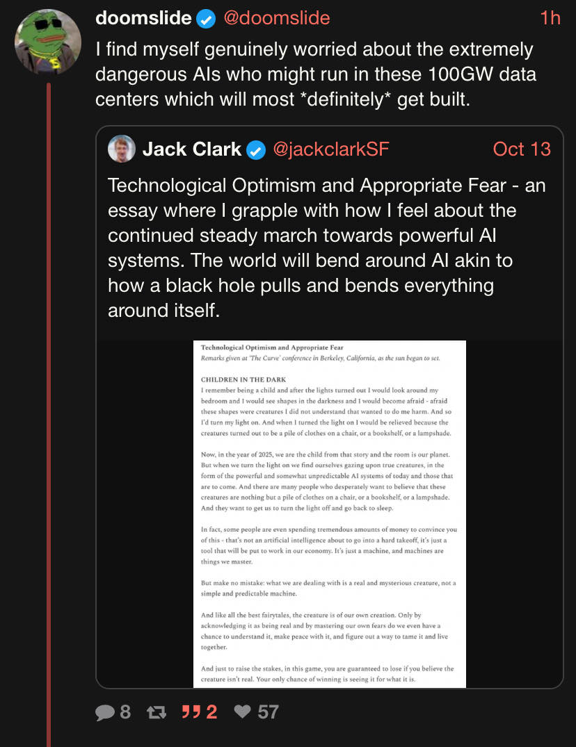 "Anthropic cofounder admits he is now “deeply afraid” … “We are dealing with a real and mysterious creature, not a simple and predictable machine … We need the courage to see things as they are.”