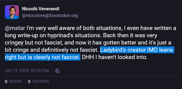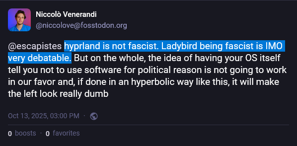 hyprland is not fascist. Ladybird being fascist is IMO very debatable. But on the whole, the idea of having your OS itself tell you not to use software for political reason is not going to work in our favor and, if done in an hyperbolic way like this, it will make the left look really dumb