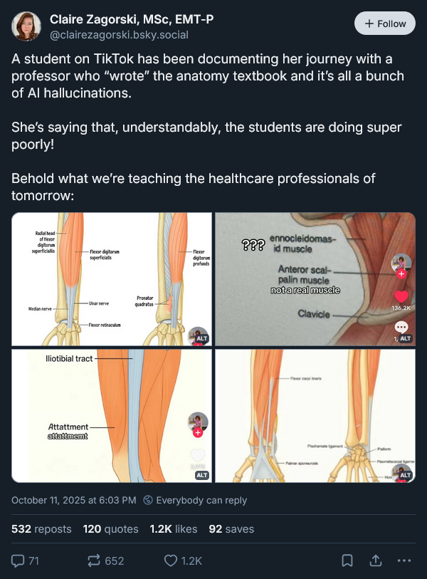 AI slop has been discovered in an anatomy textbook (the news originally broke on TikTok, but I discovered this through Bluesky):