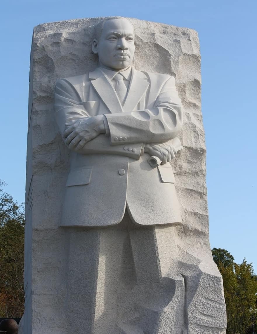 “We don’t even see his feet. He is embedded in the rock like something not yet fully born, suited and stern, rising from its roughly chiseled surface. His face is uncompromising, determined, his eyes fixed in the distance, not far from where Jefferson stands across the water. But kitsch here strains at the limits of resemblance: Is this the Dr. King of the “I Have a Dream” speech? Or the writer of the 1964 Nobel Peace Prize acceptance speech?”