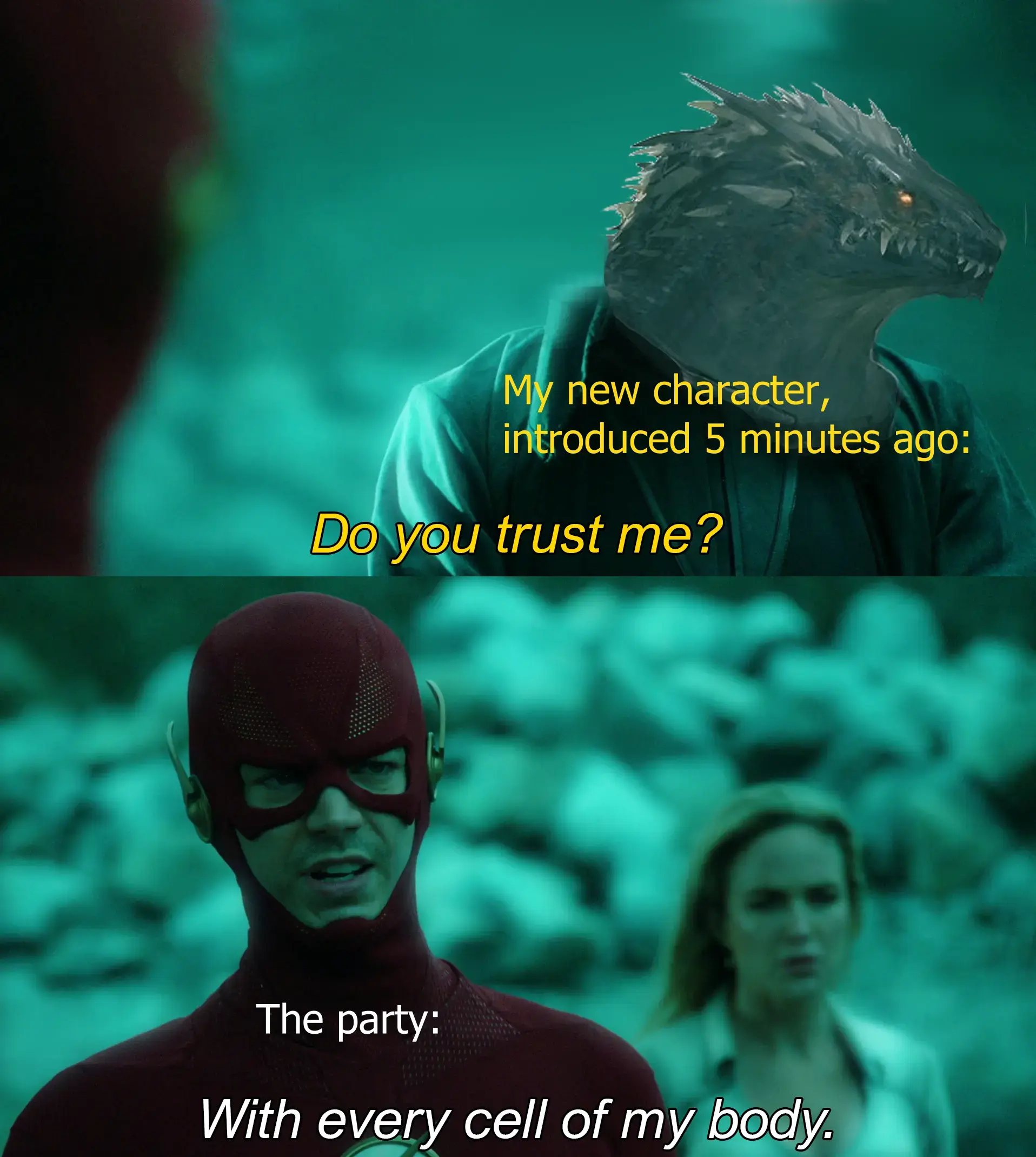 Much better than the character that nobody trusts after 20 sessions because they keep doing shady shit.
