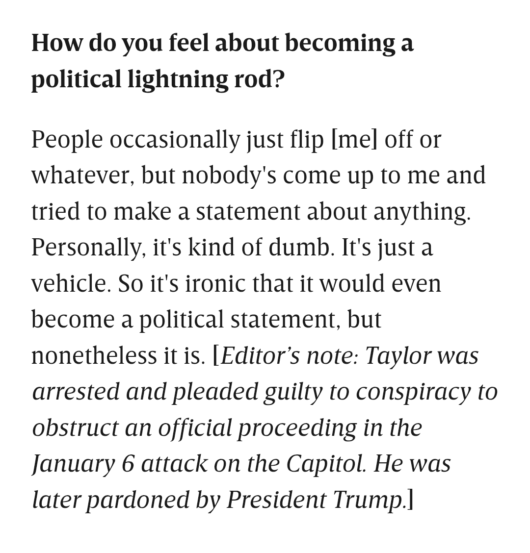“It’s just a vehicle. So it’s ironic that it would even become a political statement, but nonetheless it is.” [Editor’s note: Taylor was arrested and convicted of conspiracy to obstruct an official proceeding in the January 6 attack on the Capitol. He was later pardoned by President Trump.