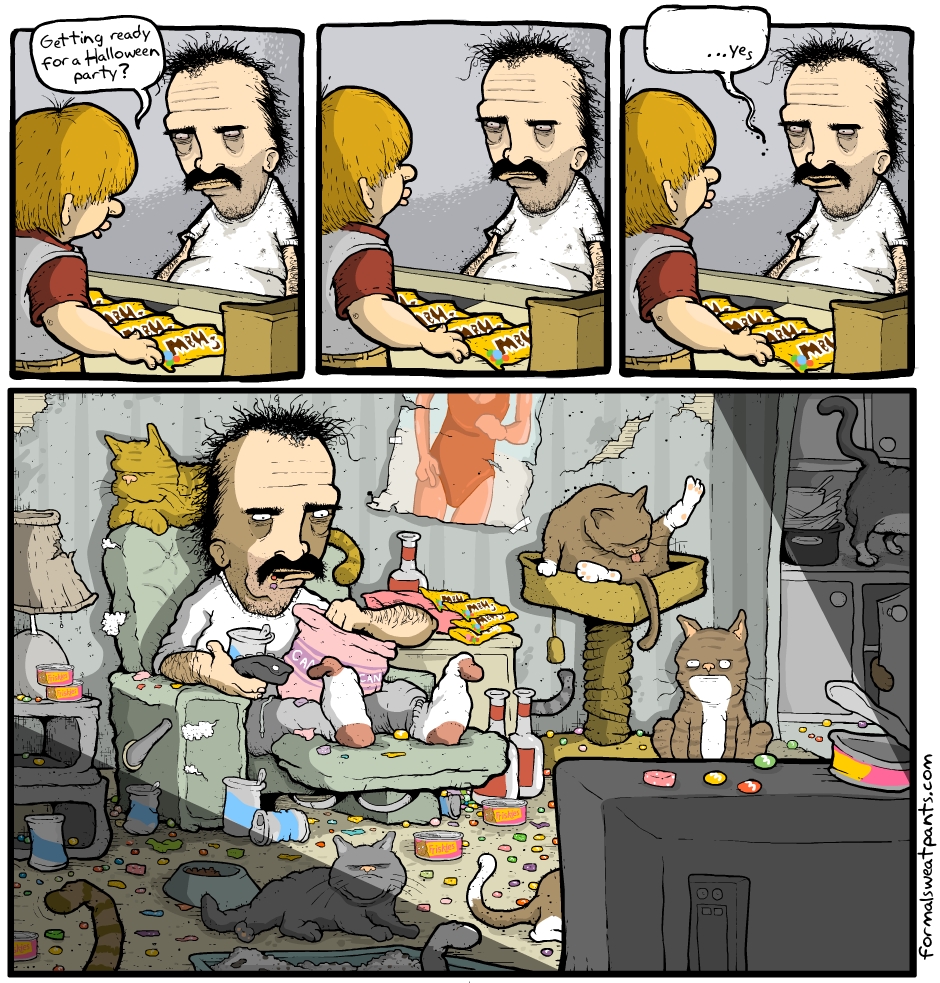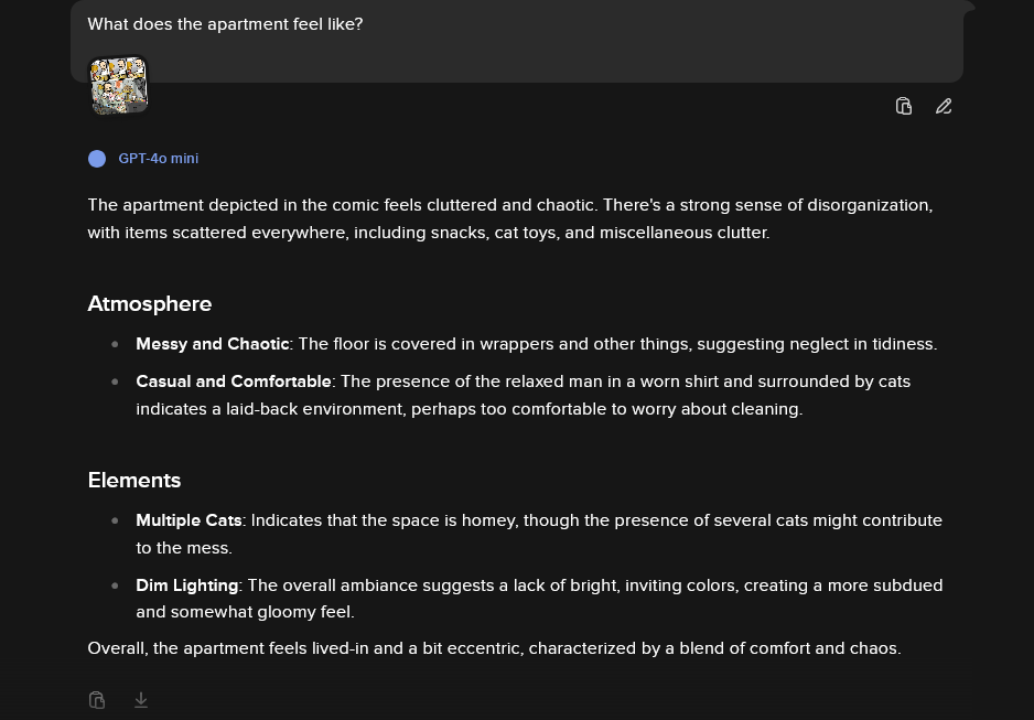 The apartment depicted in the comic feels cluttered and chaotic. There’s a strong sense of disorganization, with items scattered everywhere, including snacks, cat toys, and miscellaneous clutter. Atmosphere
