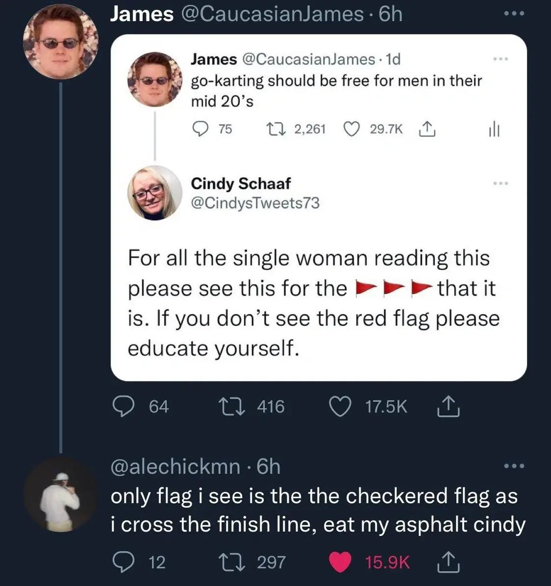 Cindy needs to calm down though. I’m sure he didn’t mean women wouldn’t be allowed on the track; just that this man really likes go-carts.
