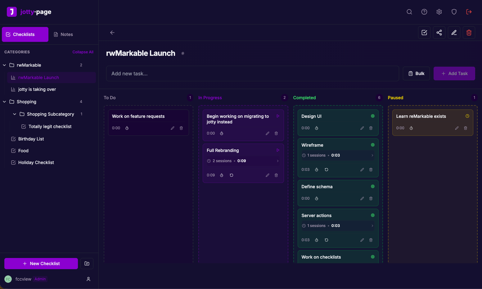 - Checklists: Create task lists with drag & drop reordering, progress bars, and categories. Supports both simple checklists and advanced task projects with Kanban boards and time tracking.