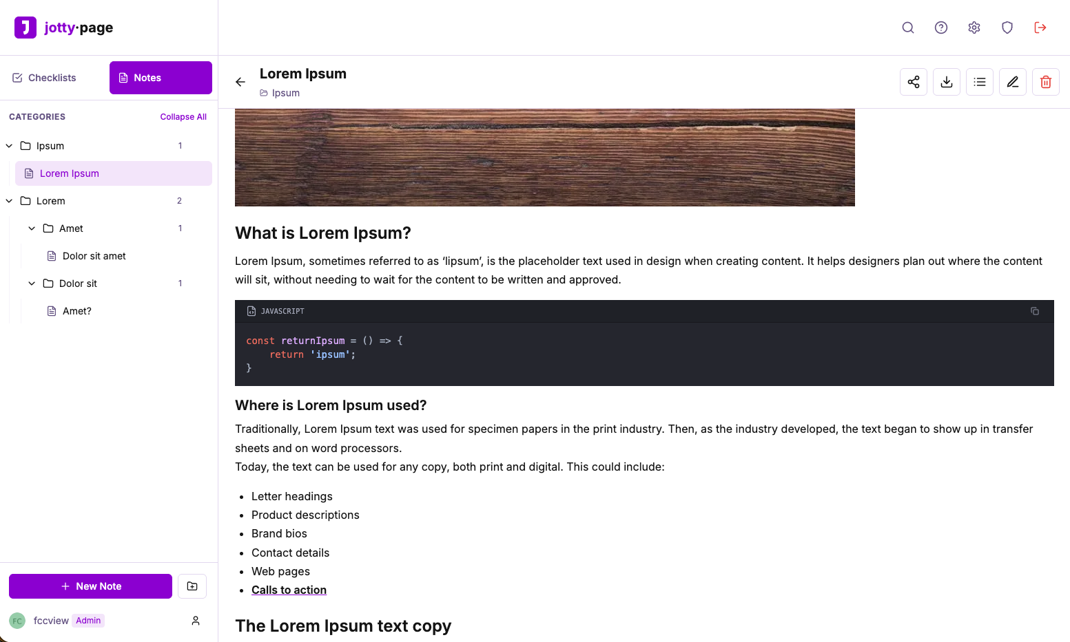 - Text Notes: A clean WYSIWYG editor for your notes, powered by TipTap with full Markdown support and codeblock syntax highlighting.