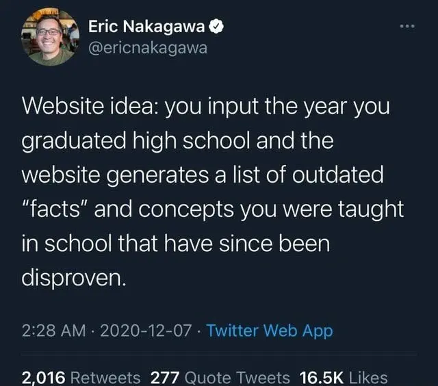 Better use the year your teacher graduated. I learned stuff in the first semesters of university not long after school my teacher simply didn’t know but younger teachers might have