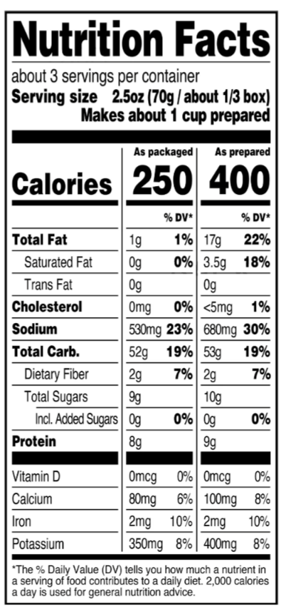 This is for the boxed stuff. That’s 1200 calories, 51 g fat, 27 protein, 159 g carbs.