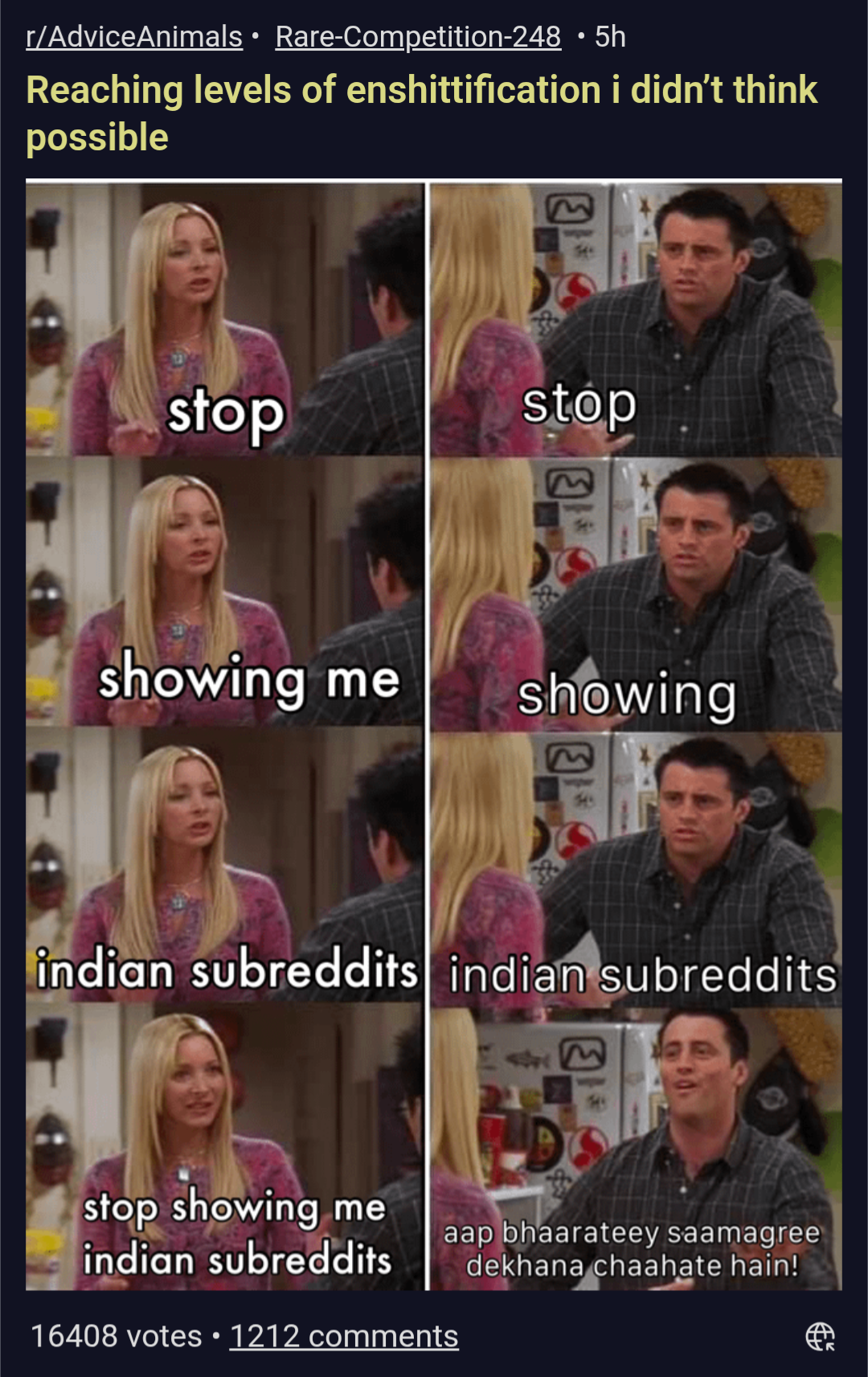 I mean, sure but then it’s not r/popular anymore. Any kind of personalization would defeat the point of the category. I’m sure you’re not getting Indian posts in your own feed (not sure about the state of personalization on r/all).