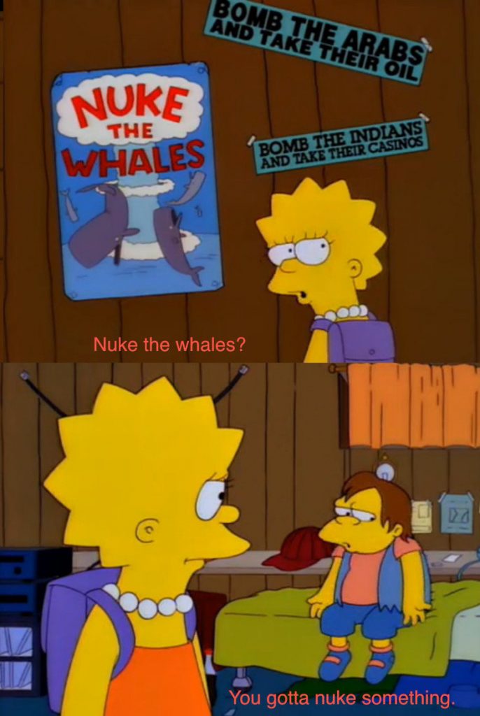 He’s been itching to nuke something since his first term. Hurricanes, he suggested at one point. And Americans voted him into office twice. Fucking morons.