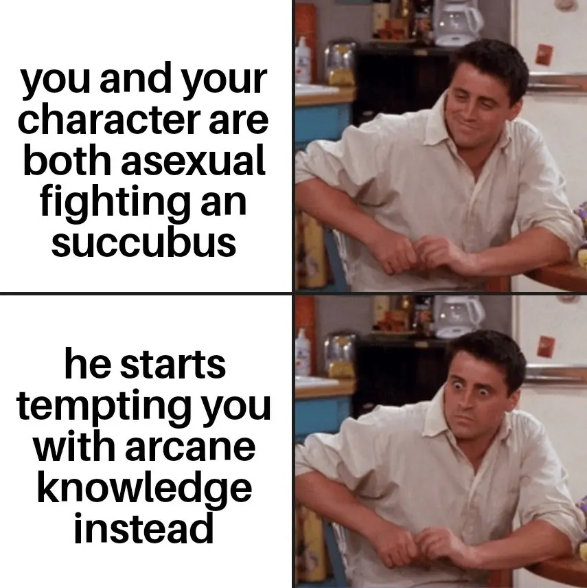I’m asexual IRL and can confirm arcane knowledge is irresistible. You can often find me reading dusty old tomes from the past. The dustier the better.