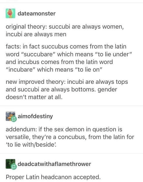 While that is traditionally correct, I prefer to think of succubus, incubus, and concubus as relating to whether they top. My demons are very progressive.
