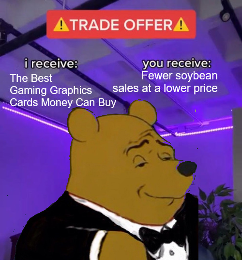 I was trying to follow any of the bullshit claims that Orange Jesus was making regarding his “deals” and it seems like we got China to agree to buy less beans than they did before and we give them AI chips?