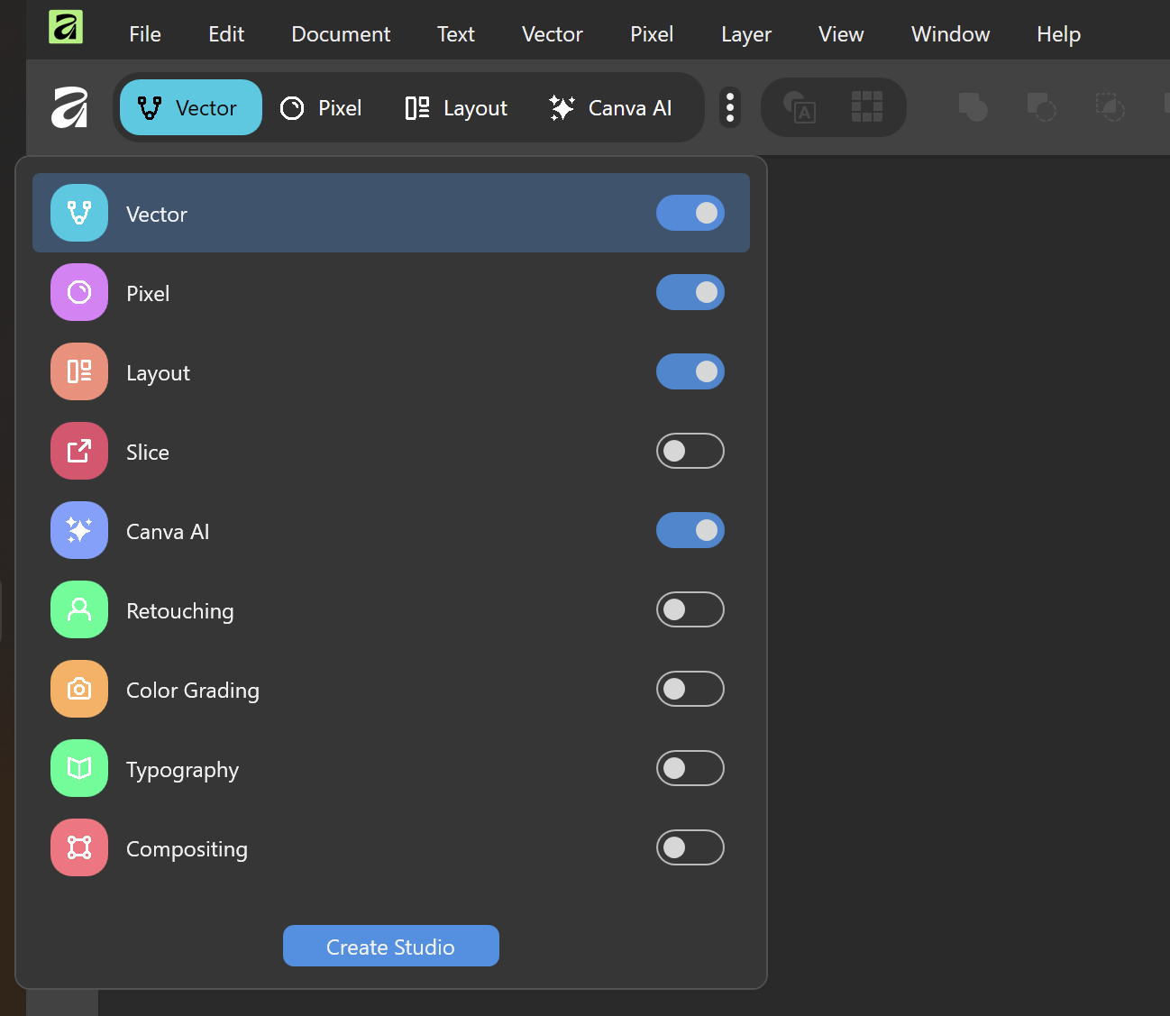 It’s now an all in one UI and no longer different applications for vector graphics, photo editing, and layout. You can switch between different UIs on the fly and Canva AI is just one of those and one you can even disable:
