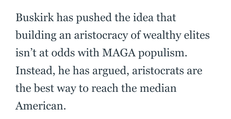 Archive article: https://archive.is/SyLKE a 2019 GOP strategy meeting in the small town of Rockbridge, Ohio, attended by billionaires and media personalities including former Fox News host Tucker Carlson, hedge fund manager Rebekah Mercer, and economist Oren Cass. The attendees formed the “Rockbridge Network,” a GOP strategy network helmed by conservative venture capitalist Chris Buskirk, whose aim is to build a MAGA movement that outlasts Donald Trump by letting business leaders shape American policy.
