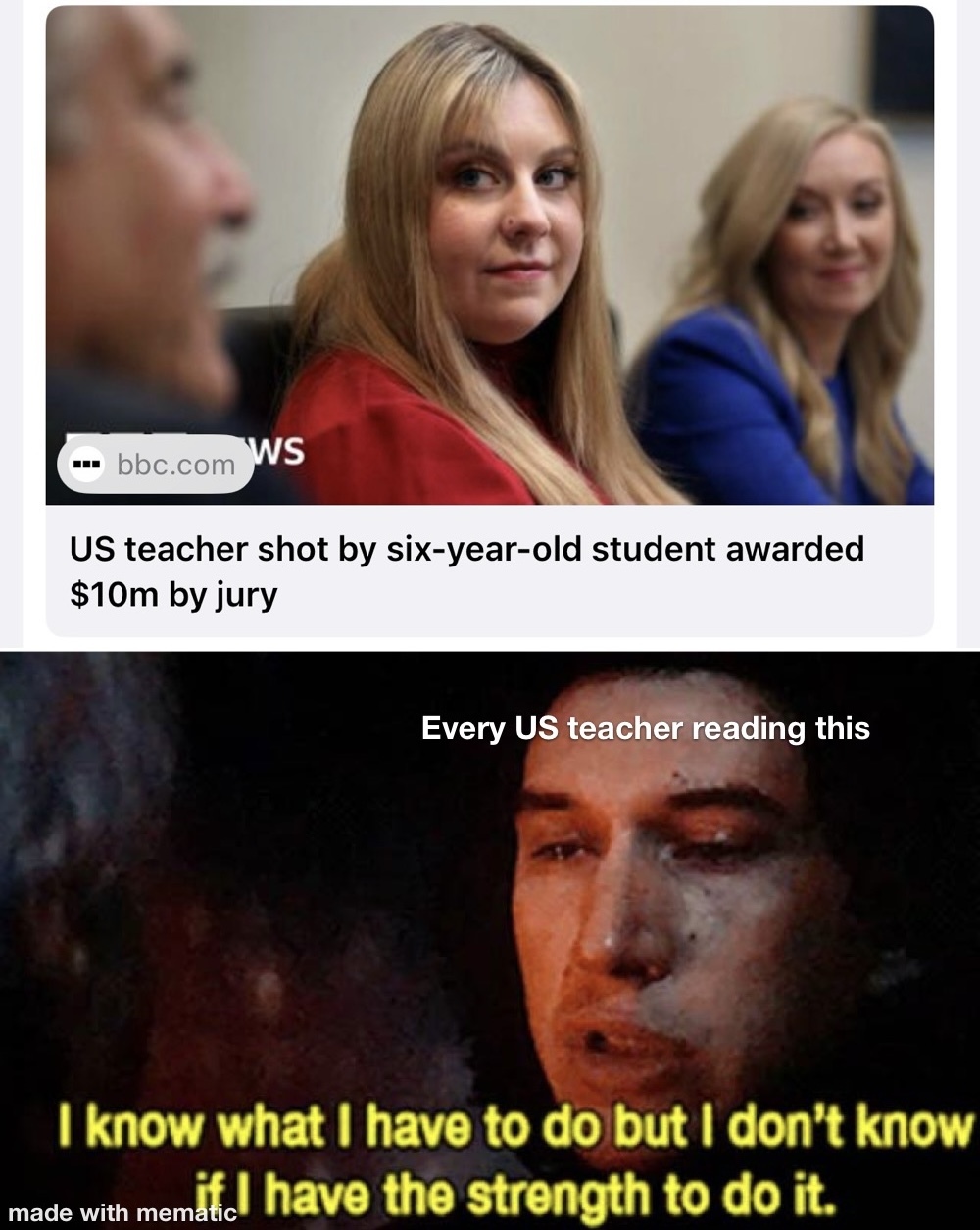 The really fucked up part is that a 6 year old shot his teacher and I never even fucking heard about it. School shootings have become so commonplace here that the only thing that made this “newsworthy” was the $10 million.