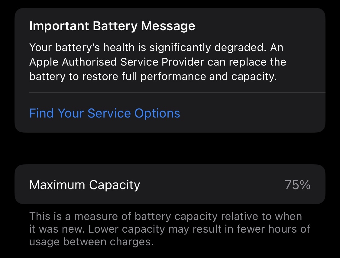 When your phone’s battery health drops to about 85%, battery life shortens noticeably.