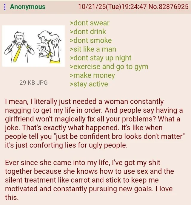 - The man loses all sights of himself and becomes a passive and meek “yes, dear” -man, and then the girlfriend (or wife if they managed to get married) eventually gets bored since the project car isn’t fun anymore, and cheats or just straight up leaves him. This pattern might also involve straight up domestic violence where the man is too embarrassed and scared to seek help