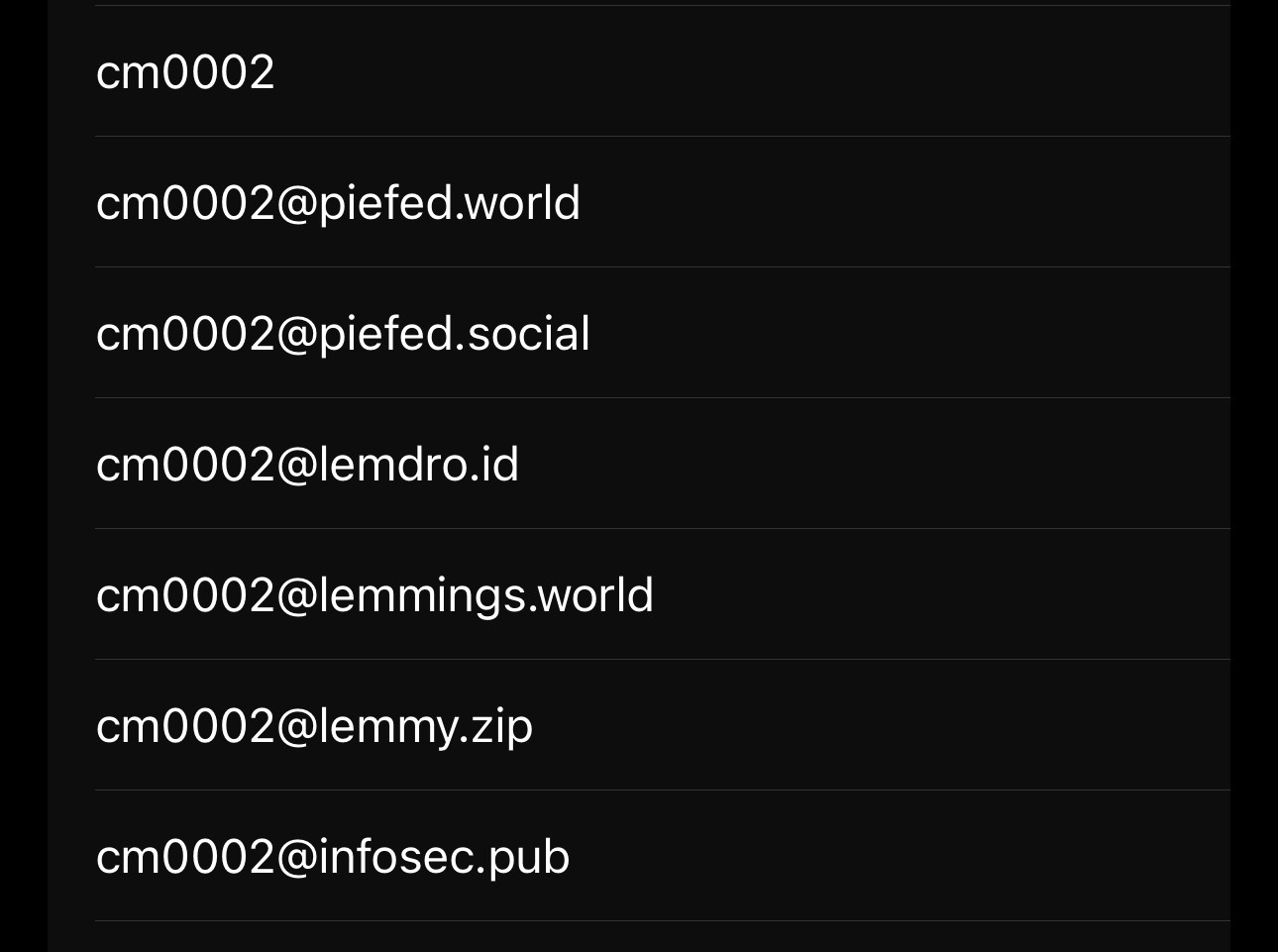 I thought it was frightening enough to imagine there were as much accounts for cm0001, but the horror that paralyzed me was the vision of this person going all through cm0000 to cm9999. At this point, they may stand up and say: I’m the Fediverse. And cm all over our comment threads.